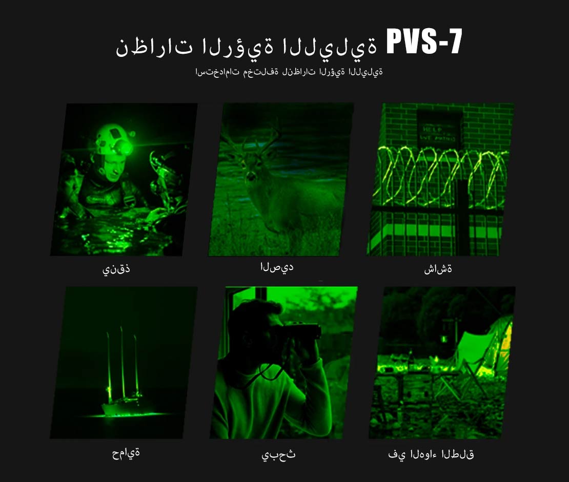 تستخدم نظارات الرؤية الليلية VA-PVS-7 أنبوب تكثيف الصور عالي الأداء، والذي يتميز بخصائص الأداء الممتاز، وخفة الوزن، والتصوير الواضح، والتشغيل البسيط، والأداء عالي التكلفة، ويمكن تغيير التكبير عن طريق استبدال العدسة الموضوعية (أو التوصيل العدسة المضاعفة). يتم تنفيذ النظارات كمقاومة للتآكل، والتي يمكن تركيبها على حزام الرأس للتشغيل بدون استخدام اليدين عند استخدامها مع قناع. يمكن تعديل VA-PVS-7 بشكل تعسفي وفقًا لمسافة العين المختلفة، ونظام التقاط الفيديو الرقمي المدمج والضوء الأحمر، والإضاءة بالأشعة تحت الحمراء، والحماية التلقائية ضد التوهج.